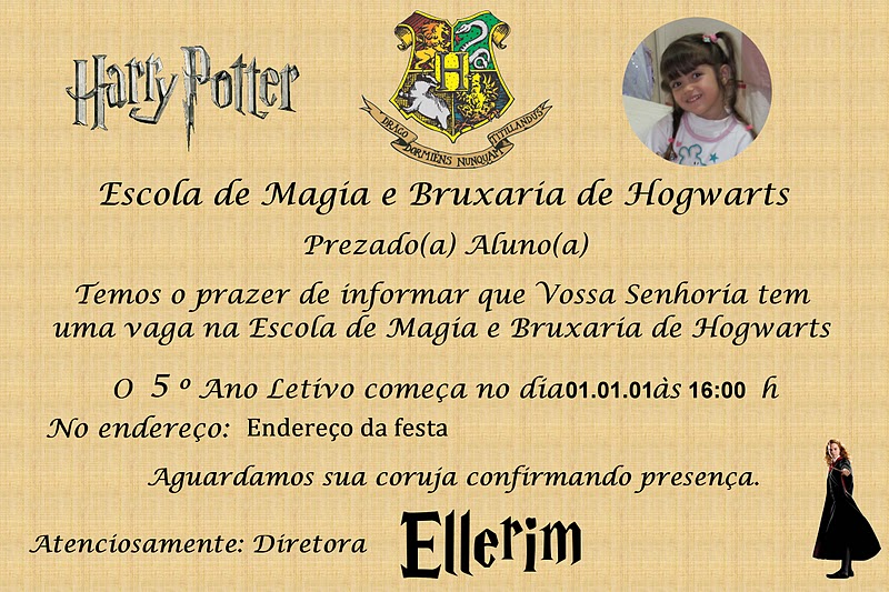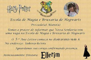 Estas primeiras imagens são convites no formato da carta que o Harry Potter recebe no primeiro livro, e são diferentes para meninos (Diretor) e Meninas (Diretora)