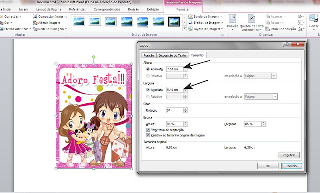 2) Depois que tiver inserido a imagem no Word, clicar em cima da imagem com o lado direito do mouse, e clicar em cima de “tamanho” ou “tamanho e posição”. Vai abrir um quadro, com os tamanhos da imagem. Digitar a altura e a largura desejada de acordo com a tabela (os tamanhos são em cm).
