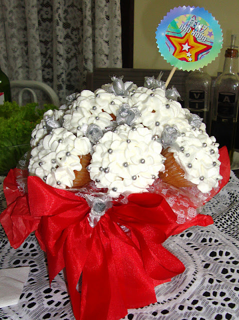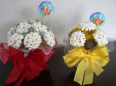 Gente, a Leitora Simone Peixoto se superou!!! Eu tinha encontrado esta ideia de bouquet de cupcake na net, e postei no blog porque amei! E não é que a nossa leitora fez mesmo!!!!! Ficou lindo demais!