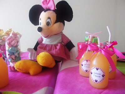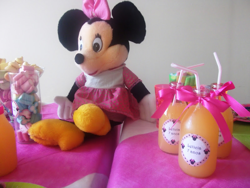 Além dos Pom Pons nossa leitora Dani fez o nome, as bandeirinhas dos sanduiches e etiquetas para as garrafinhas, tudo usando o Kit da Minnie Rosa!
