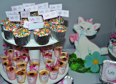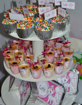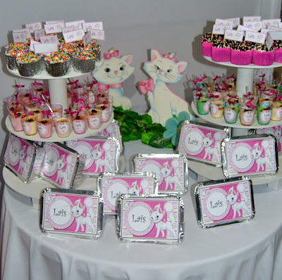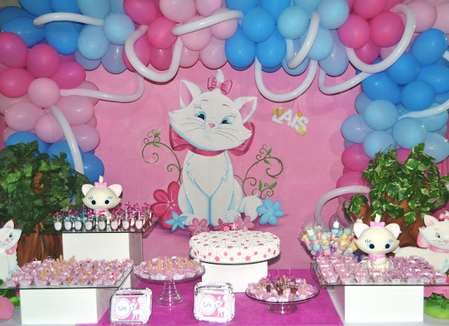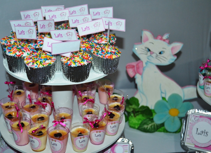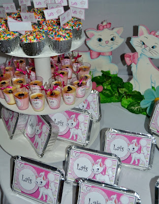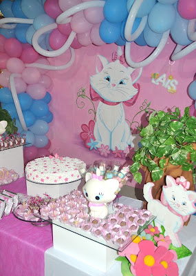 Vejam que fofas as artes que nossa leitora Kelen Rossoni fez para o aniversario de sua filha Lais com o tema Marie. Ela alugou somente o painel com a pintura da gatinha e o restante ela fez sozinha, que capricho!