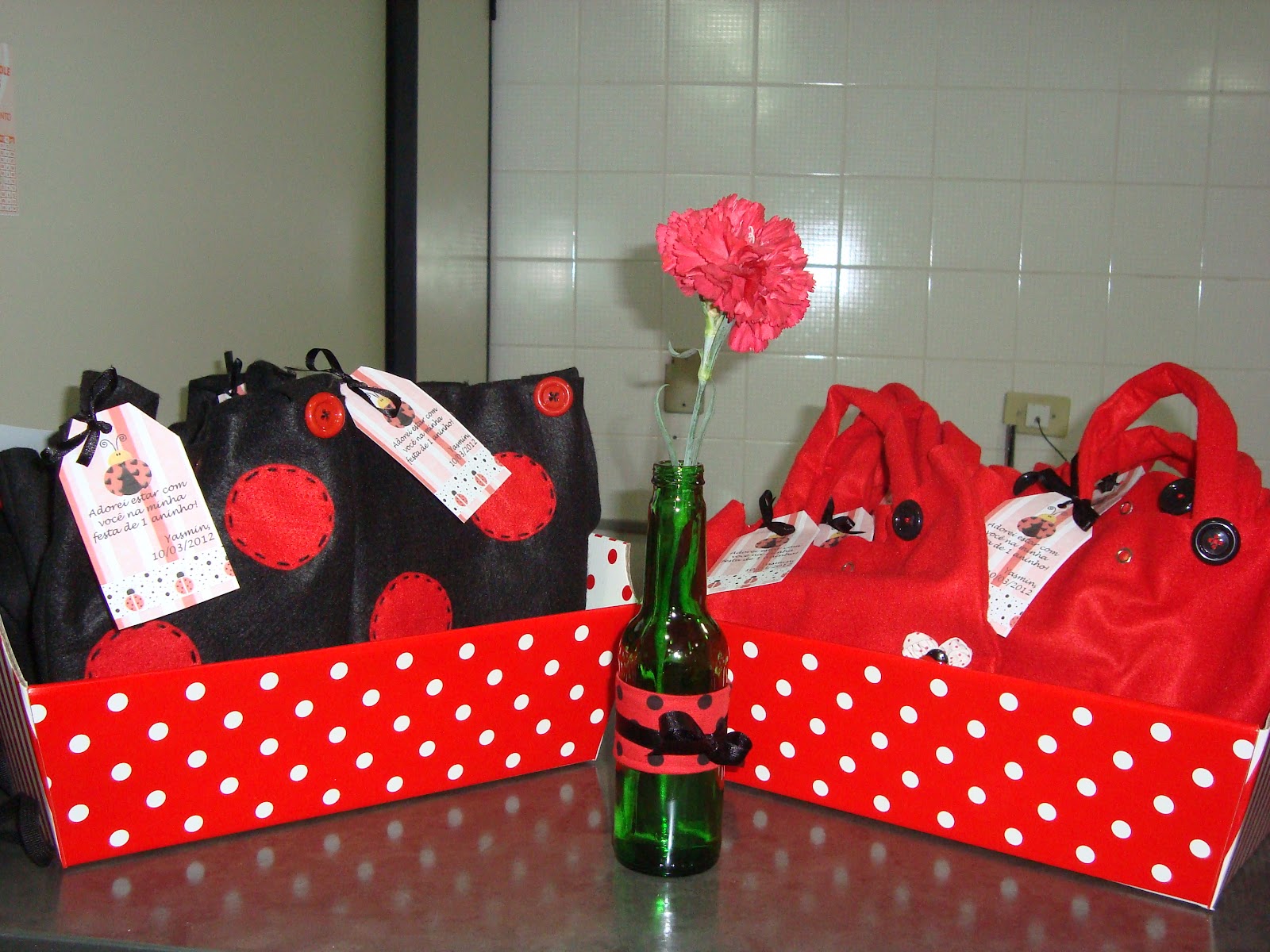 Vejas que fofas as artes que a nossa leitora Mirella do blog Mirella de Tudo Um Pouco fez para o aniversario de 1 ano de sua princessinha Yasmin.Vejam que legal essa ideia de comprar vasinhos de flores e colocar dentro dos cachepô de papelão.