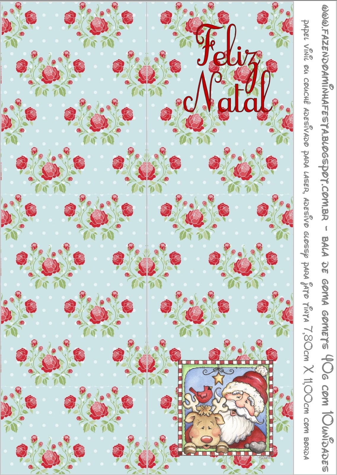 Rótulo Bala de Goma Gomets Natal com Papai Noel Azul e Vermelho com Flores: