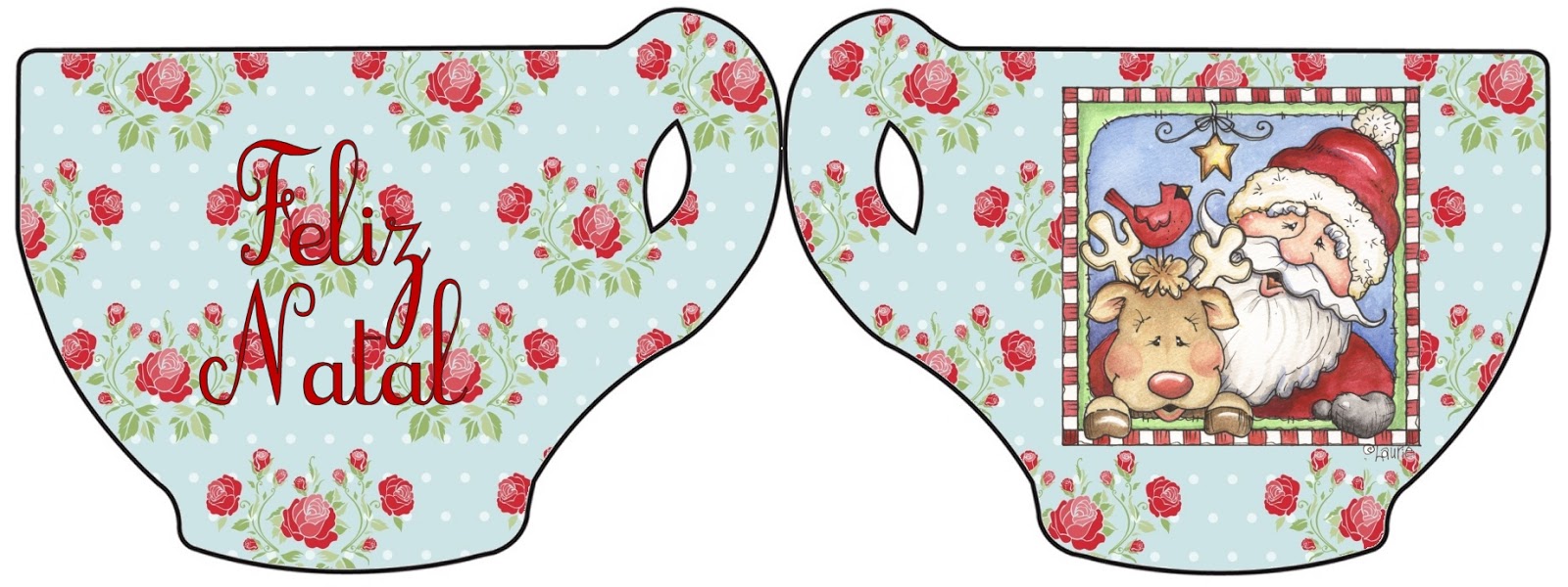 Convte Xícara Natal com Papai Noel Azul e Vermelho com Flores: