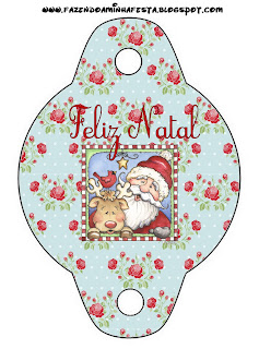 Rótulo Mini Talento Natal com Papai Noel Azul e Vermelho com Flores: