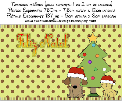 Rótulo Champagne, Vinho e Espumante Natal Gato e Cachorro Poá Marrom e Verde: