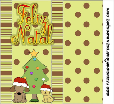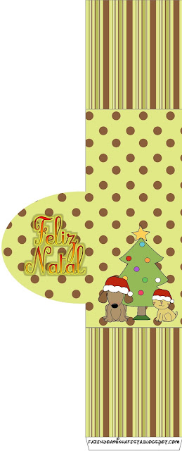 Rótulo Garrafas Natal Gato e Cachorro Poá Marrom e Verde: