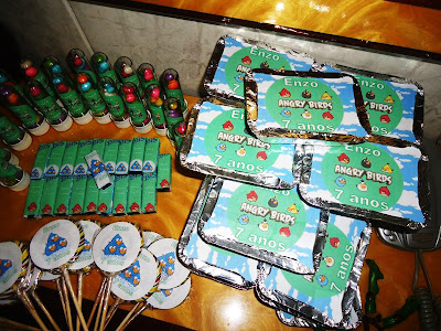 Vejam os personalizados que nossa leitora Giselle Moraes fez para a festinha do Enzo de 7 anos com o Tema Angry Birds!! Marmitinhas, Bis, Tubetes: