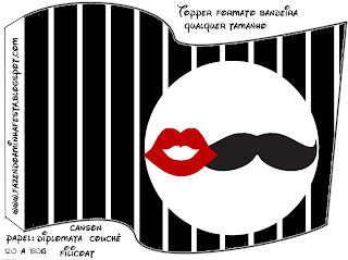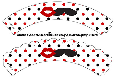 Saias Wrappers para Cupcakes Bigodes e Bocas Fundo Vermelho Preto e Branco: