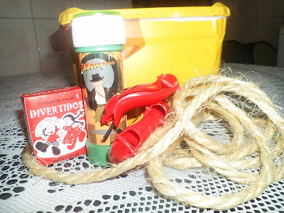 Lembrancinha feita com Pote de Sorvete embalado com papel contact amarelo, para parecer a arca da aliança e dentro havia a bolinha de sabão personalizada com nosso kit, corda que parecia chicote, estalinho e cobra naja! Super criativo!