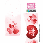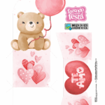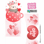 O molde apresenta ilustrações fofas, como ursos, corações, gatinhos e elementos românticos, tudo em tons suaves de rosa e vermelho. O acabamento final fica ainda mais encantador quando impresso em papel fotográfico brilho ou matte.