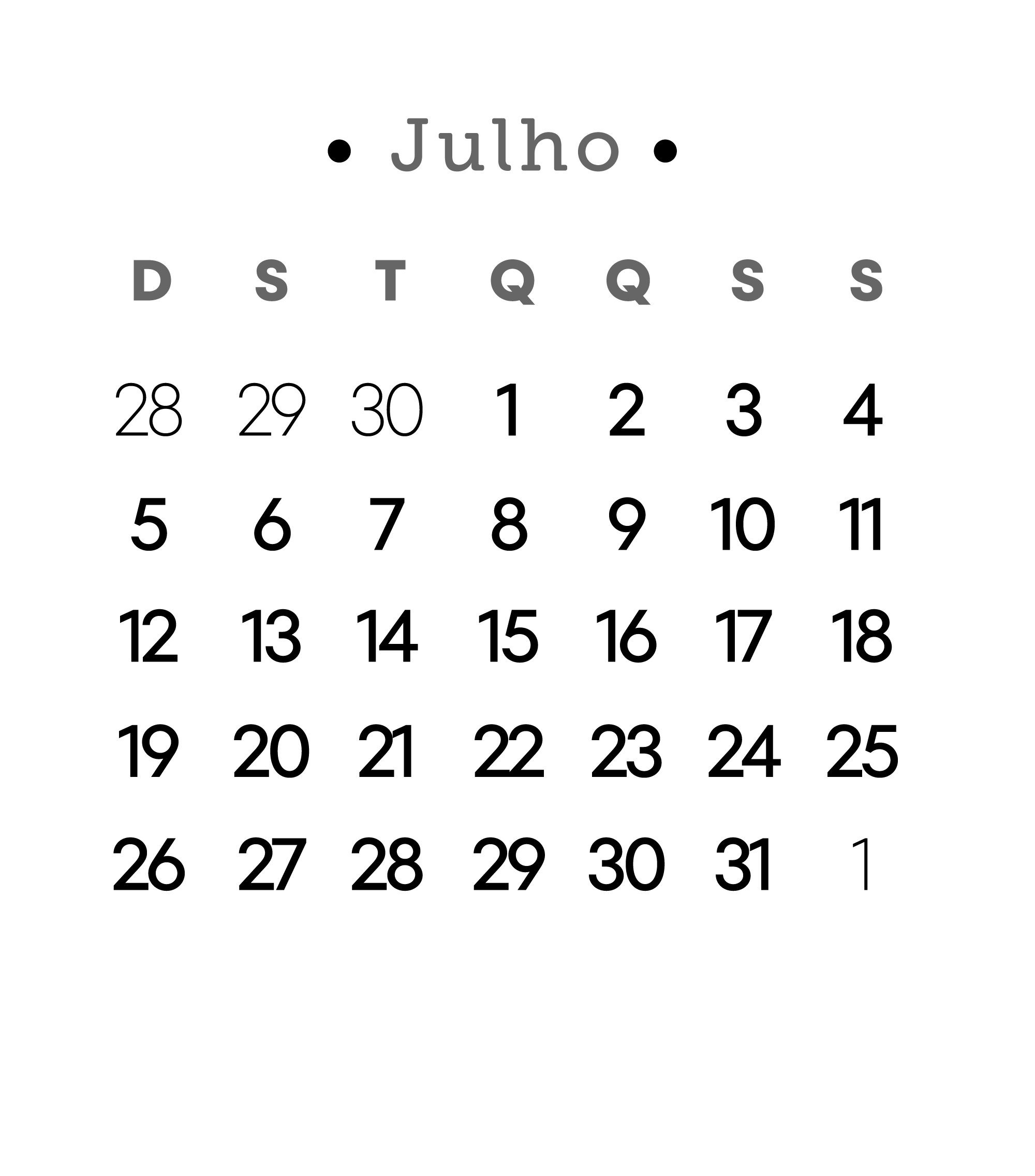 Calendario 2026 Julho Por Aline Gasda - dez 18, 2025 - 0 Comentários - 1 min. leitura Baixar imagemCalendario 2026 JulhoVocê também pode gostar de... Calendário de 2025 com Feriados para Imprimir Calendário 2024 + de 10 Modelos para Imprimir Grátis Calendário de Mesa 2023 Natal com Bolinha Grátis para Baixar Calendário 2023 para Imprimir Grátis Calendário 2021 Personalizado com Foto de Natal Calendário 2021 para Imprimir Grátis Aline Gasda Sócia fundadora, professora, apaixonada pela alegria mágica e contagiante do sorriso de uma criança. COMPARTILHE: Facebook WhatsApp WhatsApp Assinar blog por e-mailDigite seu endereço de e-mail para assinar este blog e receber notificações de novas publicações por e-mail. Endereço de e-mail Assinar Pesquisar por: Publicidade