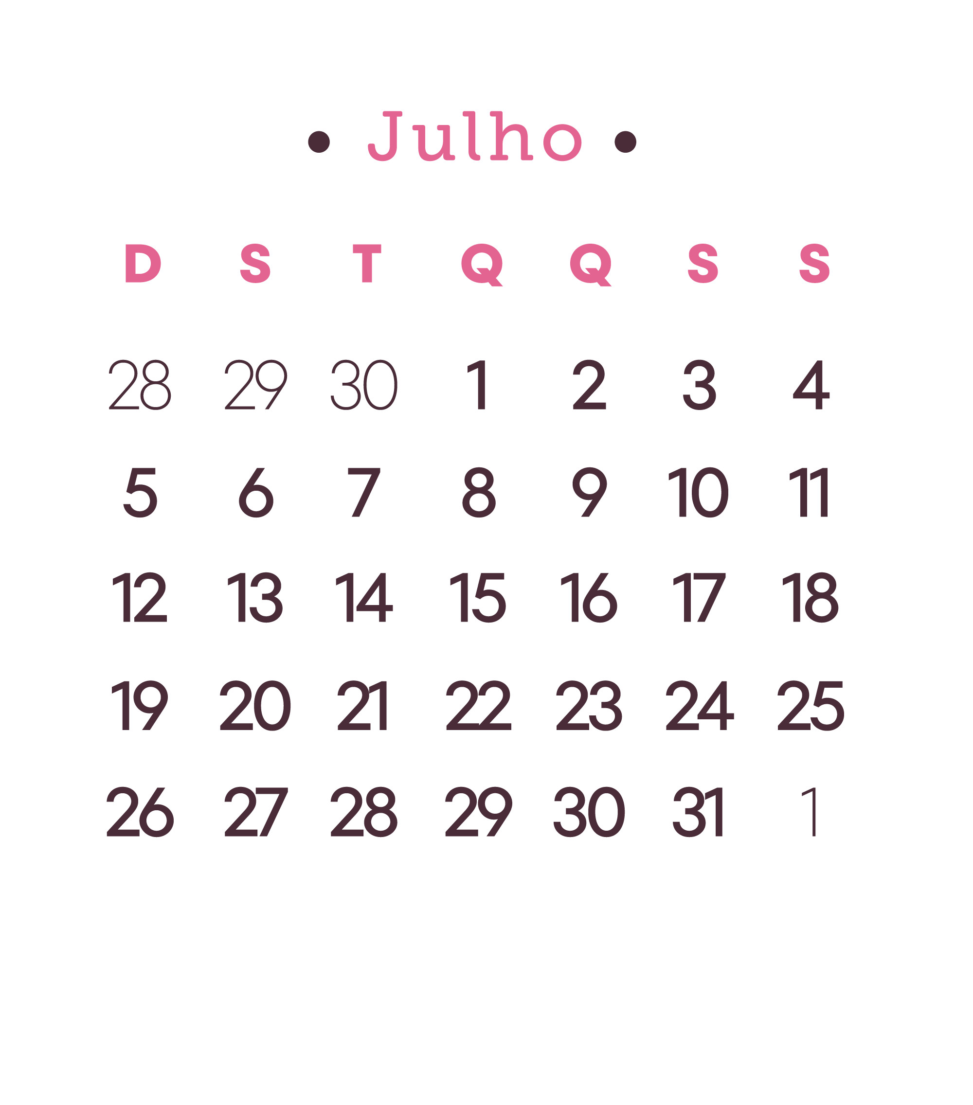 Calendario 2026 Rosa Julho Por Aline Gasda - dez 18, 2025 - 0 Comentários - 1 min. leitura Baixar imagemCalendario 2026 Rosa JulhoVocê também pode gostar de... Calendário de 2025 com Feriados para Imprimir Calendário 2024 + de 10 Modelos para Imprimir Grátis Calendário de Mesa 2023 Natal com Bolinha Grátis para Baixar Calendário 2023 para Imprimir Grátis Calendário 2021 Personalizado com Foto de Natal Calendário 2021 para Imprimir Grátis Aline Gasda Sócia fundadora, professora, apaixonada pela alegria mágica e contagiante do sorriso de uma criança. COMPARTILHE: Facebook WhatsApp WhatsApp Assinar blog por e-mailDigite seu endereço de e-mail para assinar este blog e receber notificações de novas publicações por e-mail. Endereço de e-mail Assinar Pesquisar por: Publicidade
