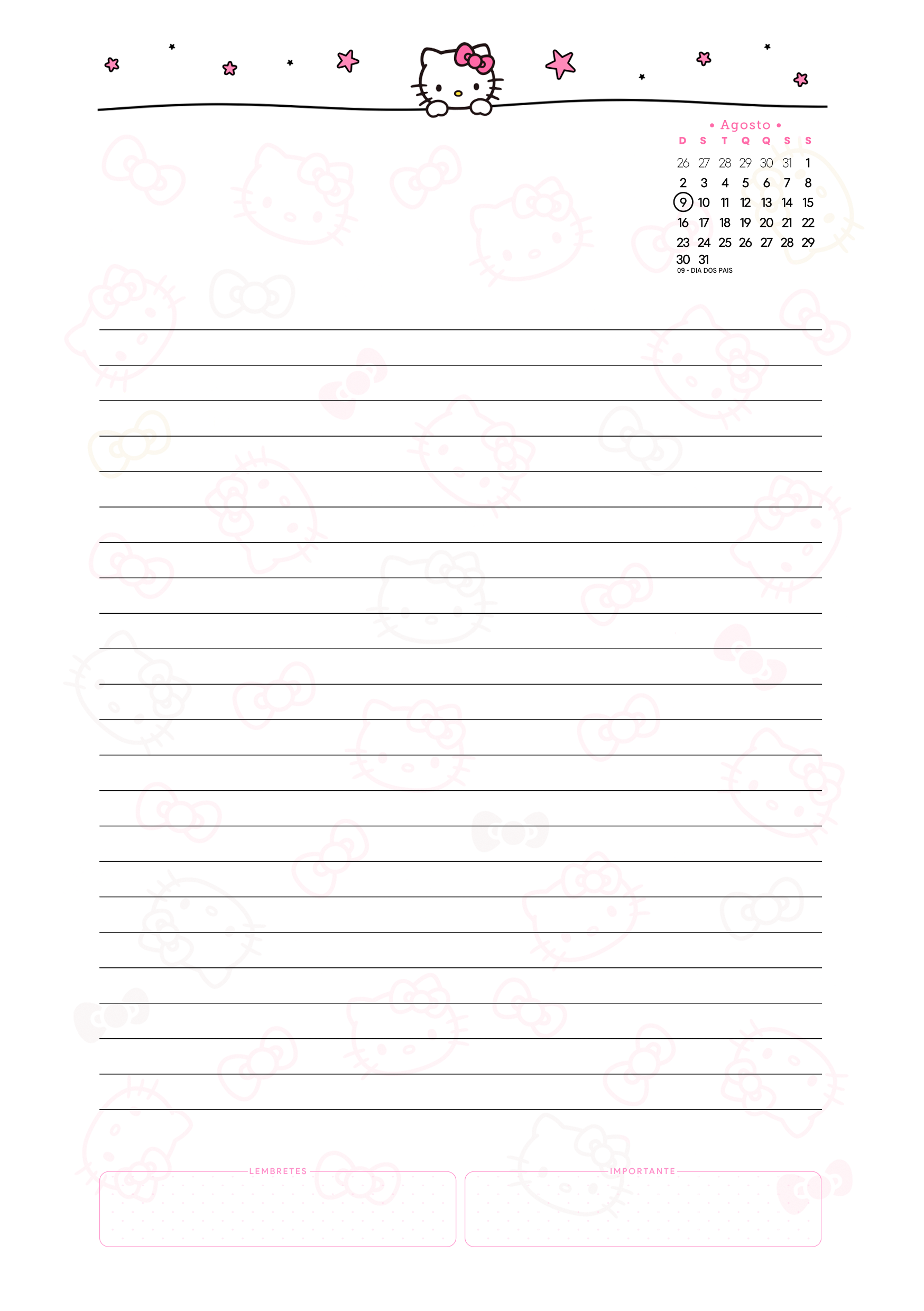 Planner Hello Kitty Agosto Permanente Miolo Agenda sem Hora Por Aline Gasda - dez 16, 2025 - 0 Comentários - 1 min. leitura Baixar imagemPlanner Hello Kitty Agosto Permanente Miolo Agenda sem HoraAssinar blog por e-mailDigite seu endereço de e-mail para assinar este blog e receber notificações de novas publicações por e-mail. Endereço de e-mail Assinar Você também pode gostar de... Planner Professor 2025 – Arquivo Digital – Download Grátis Planner 2025 Xadrez Minimalista para Imprimir – Download Grátis Planner Autismo 2025 – Modelo Grátis + 100 páginas! Planner Colorido 2025 para Imprimir – Download Grátis Planner 2025 para Imprimir Grátis – Tudo o que você precisa sobre! Planner Minnie 2025 – Grátis para Imprimir Aline Gasda Sócia fundadora, professora, apaixonada pela alegria mágica e contagiante do sorriso de uma criança. COMPARTILHE: Facebook WhatsApp WhatsApp Pesquisar por: Publicidade