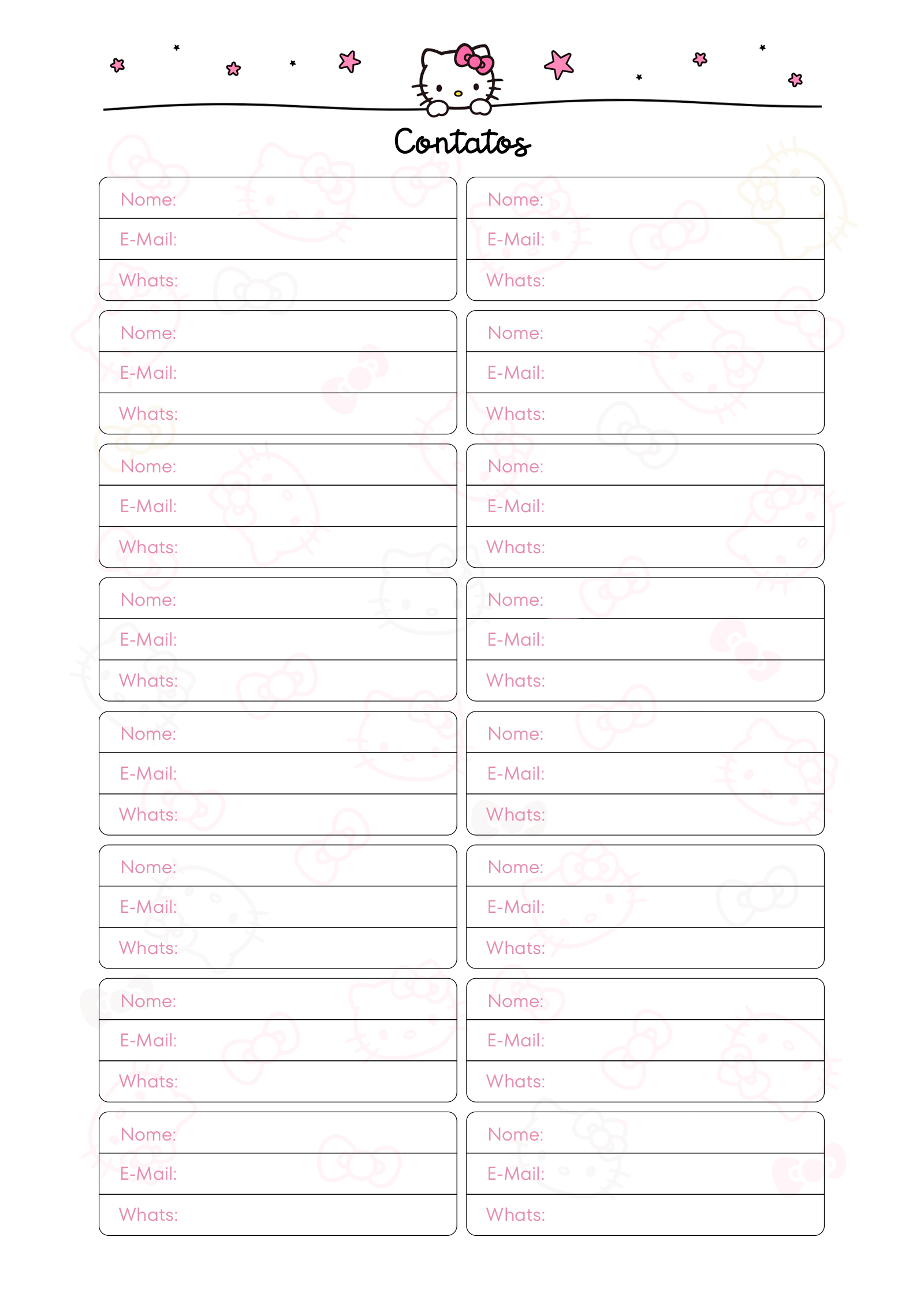 Planner Hello Kitty Contatos Por Aline Gasda - dez 16, 2025 - 0 Comentários - 1 min. leitura Baixar imagemPlanner Hello Kitty ContatosAssinar blog por e-mailDigite seu endereço de e-mail para assinar este blog e receber notificações de novas publicações por e-mail. Endereço de e-mail Assinar Você também pode gostar de... Planner Professor 2025 – Arquivo Digital – Download Grátis Planner 2025 Xadrez Minimalista para Imprimir – Download Grátis Planner Autismo 2025 – Modelo Grátis + 100 páginas! Planner Colorido 2025 para Imprimir – Download Grátis Planner 2025 para Imprimir Grátis – Tudo o que você precisa sobre! Planner Minnie 2025 – Grátis para Imprimir Aline Gasda Sócia fundadora, professora, apaixonada pela alegria mágica e contagiante do sorriso de uma criança. COMPARTILHE: Facebook WhatsApp WhatsApp Pesquisar por: Publicidade