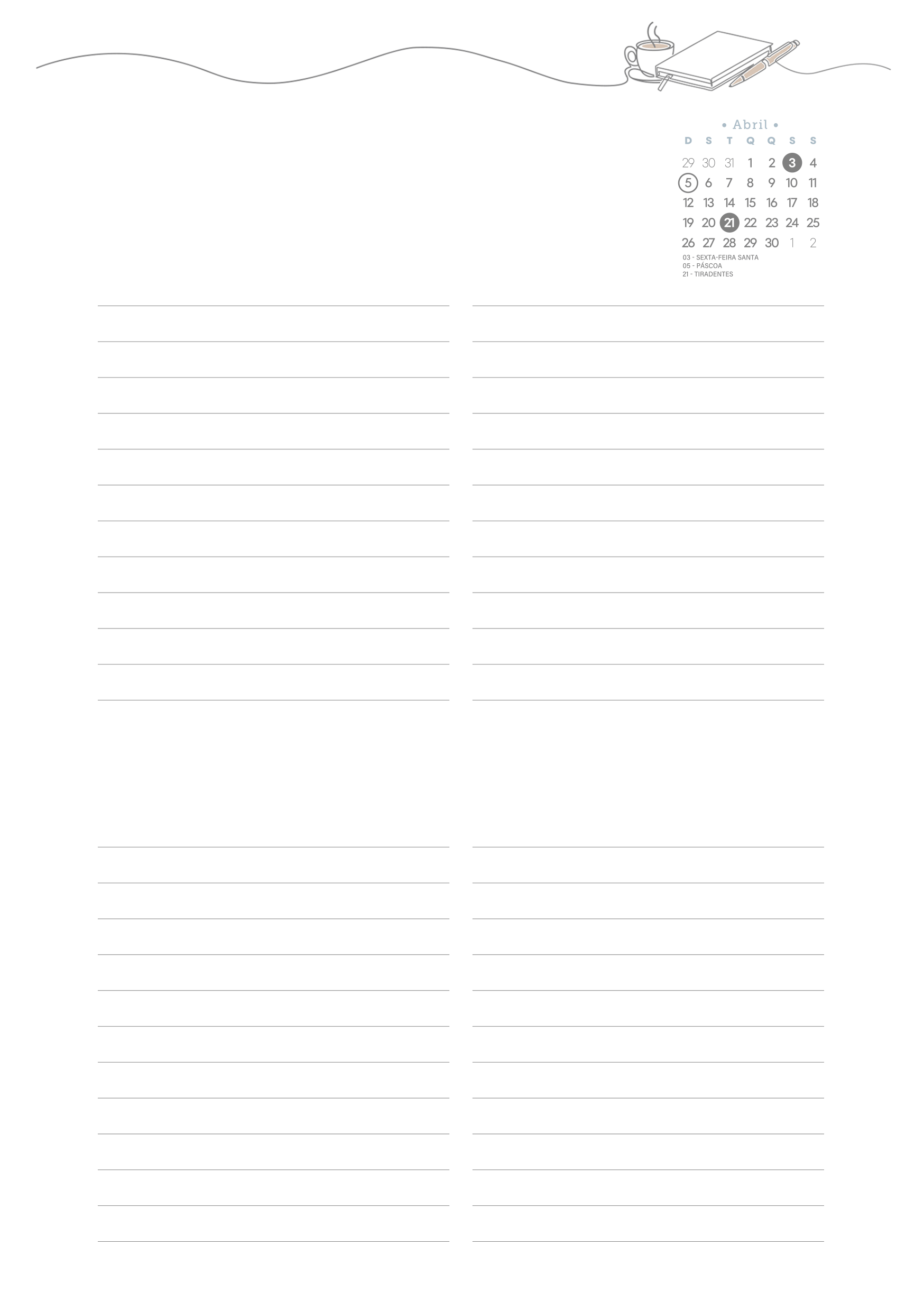 Planner Tons Pasteis Abril Miolo Agenda Sabado e Domingo sem Hora Por Aline Gasda - dez 21, 2025 - 0 Comentários - 1 min. leitura Baixar imagemPlanner Tons Pasteis Abril Miolo Agenda Sabado e Domingo sem HoraVocê também pode gostar de... Planner Stitch 2026 – Grátis para Imprimir Planner Capivara 2026 – Grátis para Imprimir Planner Colorido 2026 para Imprimir – Download Grátis Planner 2026 para Imprimir Grátis Planner Hello Kitty 2026 – Grátis para Imprimir Planner Professor 2025 – Arquivo Digital – Download Grátis Aline Gasda Sócia fundadora, professora, apaixonada pela alegria mágica e contagiante do sorriso de uma criança. COMPARTILHE: Facebook WhatsApp WhatsApp Assinar blog por e-mailDigite seu endereço de e-mail para assinar este blog e receber notificações de novas publicações por e-mail. Endereço de e-mail Assinar Pesquisar por: Publicidade
