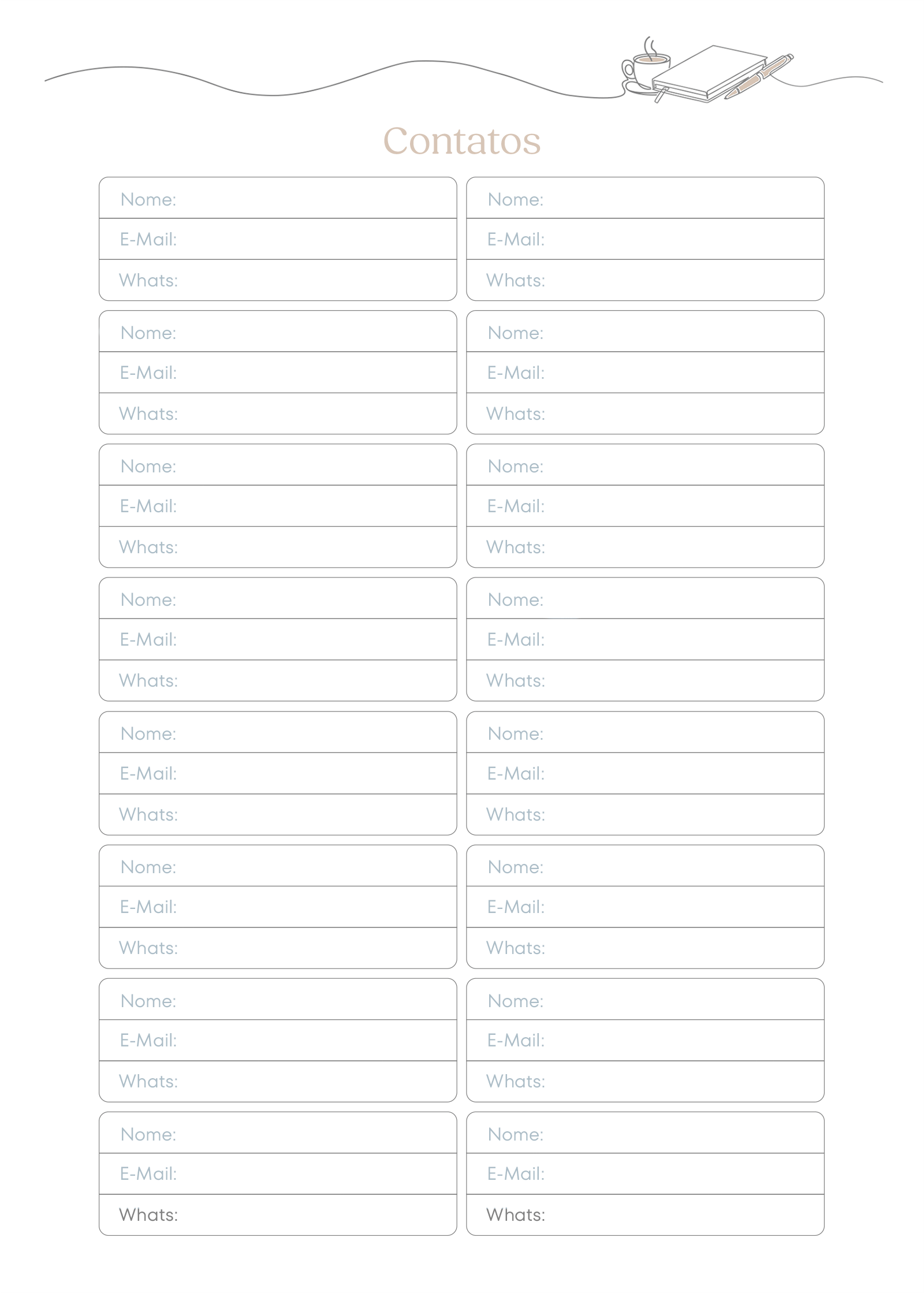 Planner Tons Pasteis Contatos Por Aline Gasda - dez 21, 2025 -Atualizado em: dez 21, 2025 - 0 Comentários - 1 min. leitura Baixar imagemPlanner Tons Pasteis ContatosVocê também pode gostar de... Planner 2026 para Imprimir Grátis Planner Hello Kitty 2026 – Grátis para Imprimir Planner Professor 2025 – Arquivo Digital – Download Grátis Planner 2025 Xadrez Minimalista para Imprimir – Download Grátis Planner Autismo 2025 – Modelo Grátis + 100 páginas! Planner Colorido 2025 para Imprimir – Download Grátis Aline Gasda Sócia fundadora, professora, apaixonada pela alegria mágica e contagiante do sorriso de uma criança. COMPARTILHE: Facebook WhatsApp WhatsApp Assinar blog por e-mailDigite seu endereço de e-mail para assinar este blog e receber notificações de novas publicações por e-mail. Endereço de e-mail Assinar Pesquisar por: Publicidade