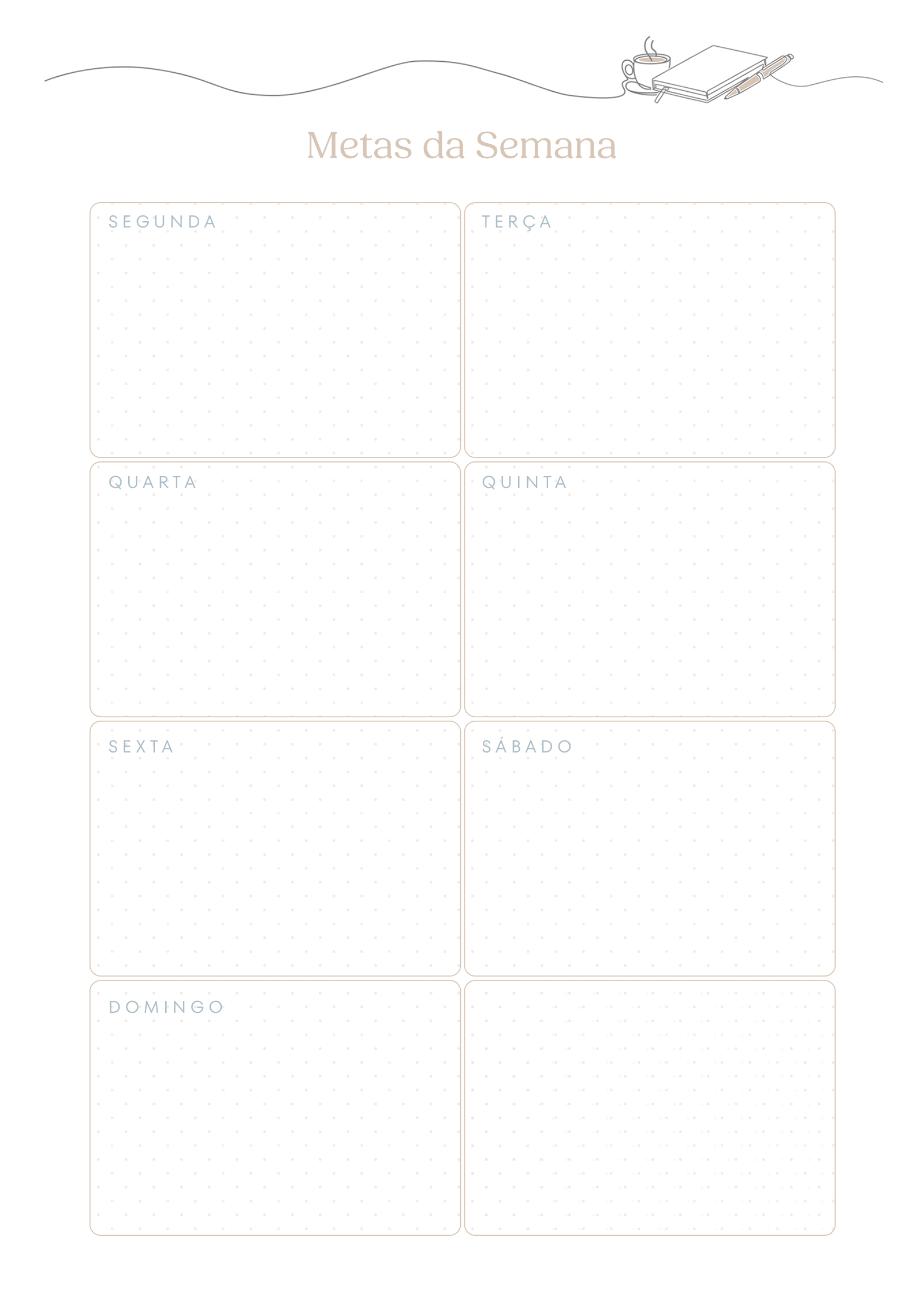 Planner Tons Pasteis Metas da Semana Por Aline Gasda - dez 21, 2025 - 0 Comentários - 1 min. leitura Baixar imagemPlanner Tons Pasteis Metas da SemanaVocê também pode gostar de... Planner Stitch 2026 – Grátis para Imprimir Planner Capivara 2026 – Grátis para Imprimir Planner Colorido 2026 para Imprimir – Download Grátis Planner 2026 para Imprimir Grátis Planner Hello Kitty 2026 – Grátis para Imprimir Planner Professor 2025 – Arquivo Digital – Download Grátis Aline Gasda Sócia fundadora, professora, apaixonada pela alegria mágica e contagiante do sorriso de uma criança. COMPARTILHE: Facebook WhatsApp WhatsApp Assinar blog por e-mailDigite seu endereço de e-mail para assinar este blog e receber notificações de novas publicações por e-mail. Endereço de e-mail Assinar Pesquisar por: Publicidade