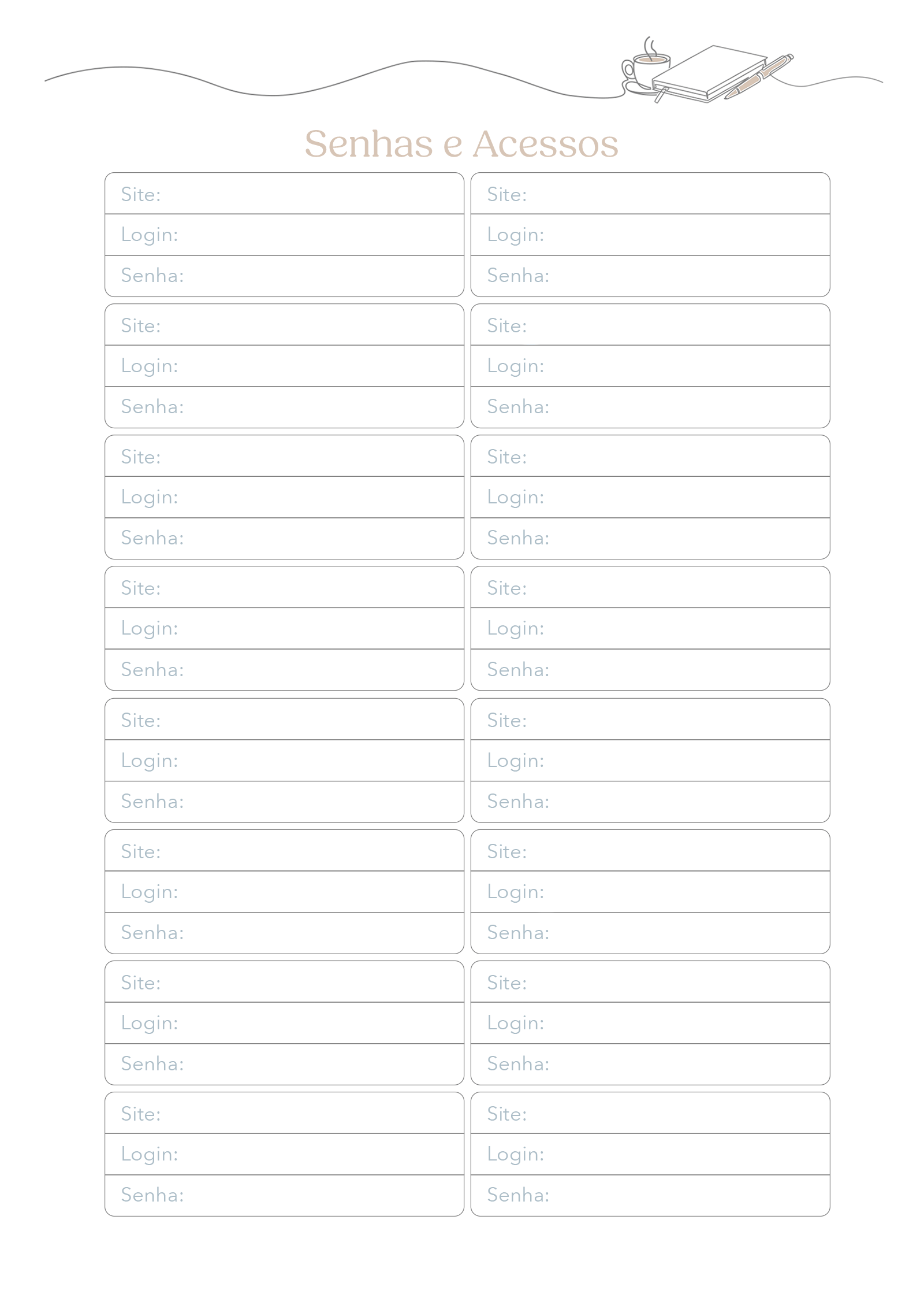 Planner Tons Pasteis Senhas e Acessos Por Aline Gasda - dez 21, 2025 - 0 Comentários - 1 min. leitura Baixar imagemPlanner Tons Pasteis Senhas e AcessosVocê também pode gostar de... Planner 2026 para Imprimir Grátis Planner Hello Kitty 2026 – Grátis para Imprimir Planner Professor 2025 – Arquivo Digital – Download Grátis Planner 2025 Xadrez Minimalista para Imprimir – Download Grátis Planner Autismo 2025 – Modelo Grátis + 100 páginas! Planner Colorido 2025 para Imprimir – Download Grátis Aline Gasda Sócia fundadora, professora, apaixonada pela alegria mágica e contagiante do sorriso de uma criança. COMPARTILHE: Facebook WhatsApp WhatsApp Assinar blog por e-mailDigite seu endereço de e-mail para assinar este blog e receber notificações de novas publicações por e-mail. Endereço de e-mail Assinar Pesquisar por: Publicidade