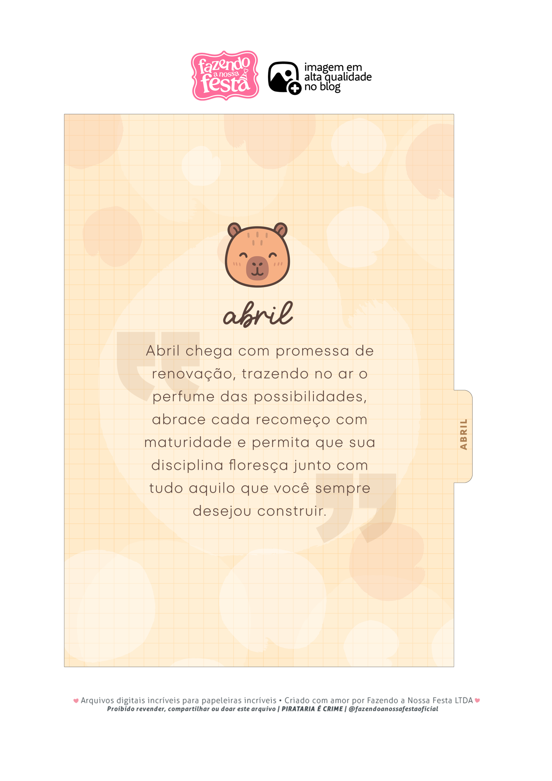 Capa de ABRIL Planner Capivara Por Aline Gasda - jan 5, 2026 - 0 Comentários - 1 min. leitura Baixar imagemCapa de ABRIL Planner CapivaraVocê também pode gostar de... Planner Colorido 2026 para Imprimir – Download Grátis Planner Tons Pastéis 2026 – Grátis para Imprimir Planner 2026 para Imprimir Grátis Planner Hello Kitty 2026 – Grátis para Imprimir Planner Professor 2025 – Arquivo Digital – Download Grátis Planner 2025 Xadrez Minimalista para Imprimir – Download Grátis Aline Gasda Sócia fundadora, professora, apaixonada pela alegria mágica e contagiante do sorriso de uma criança. COMPARTILHE: Facebook WhatsApp WhatsApp Assinar blog por e-mailDigite seu endereço de e-mail para assinar este blog e receber notificações de novas publicações por e-mail. Endereço de e-mail Assinar Pesquisar por: Publicidade
