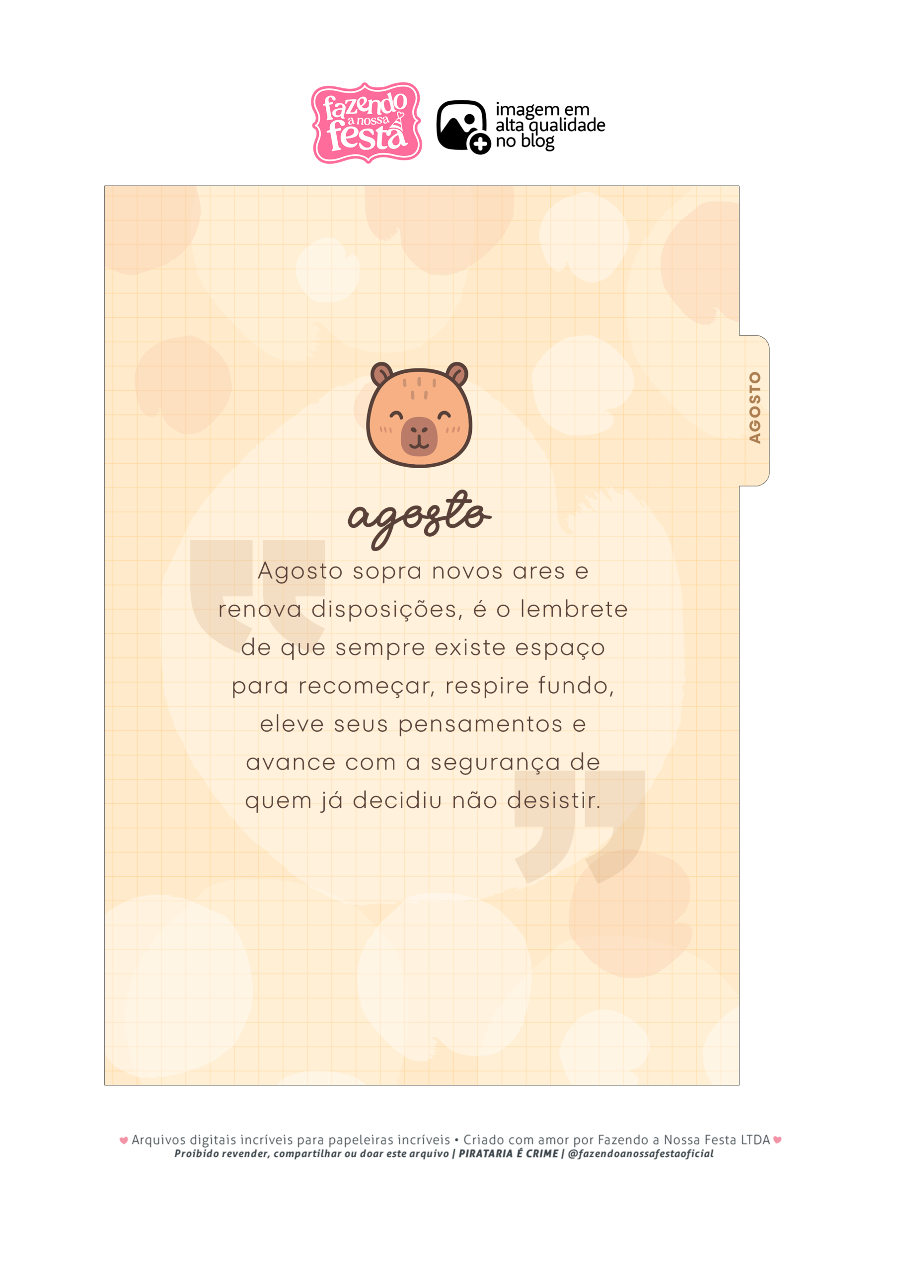 Capa de AGOSTO Planner Capivara Por Aline Gasda - jan 5, 2026 - 0 Comentários - 1 min. leitura Baixar imagemCapa de AGOSTO Planner CapivaraVocê também pode gostar de... Planner Colorido 2026 para Imprimir – Download Grátis Planner Tons Pastéis 2026 – Grátis para Imprimir Planner 2026 para Imprimir Grátis Planner Hello Kitty 2026 – Grátis para Imprimir Planner Professor 2025 – Arquivo Digital – Download Grátis Planner 2025 Xadrez Minimalista para Imprimir – Download Grátis Aline Gasda Sócia fundadora, professora, apaixonada pela alegria mágica e contagiante do sorriso de uma criança. COMPARTILHE: Facebook WhatsApp WhatsApp Assinar blog por e-mailDigite seu endereço de e-mail para assinar este blog e receber notificações de novas publicações por e-mail. Endereço de e-mail Assinar Pesquisar por: Publicidade
