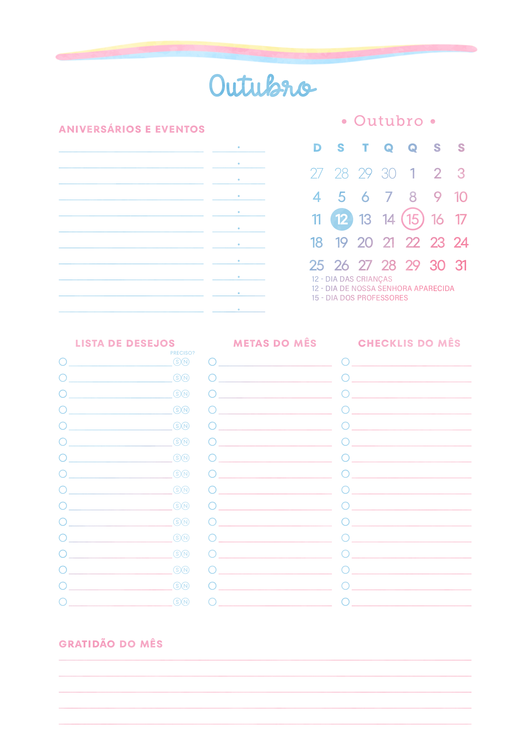 Calendario Mensal Outubro Planner Colorido 2026 Por Aline Gasda - jan 2, 2026 - 0 Comentários - 1 min. leitura Baixar imagemCalendario Mensal Outubro Planner Colorido 2026Você também pode gostar de... Planner Tons Pastéis 2026 – Grátis para Imprimir Planner 2026 para Imprimir Grátis Planner Hello Kitty 2026 – Grátis para Imprimir Planner Professor 2025 – Arquivo Digital – Download Grátis Planner 2025 Xadrez Minimalista para Imprimir – Download Grátis Planner Autismo 2025 – Modelo Grátis + 100 páginas! Aline Gasda Sócia fundadora, professora, apaixonada pela alegria mágica e contagiante do sorriso de uma criança. COMPARTILHE: Facebook WhatsApp WhatsApp Assinar blog por e-mailDigite seu endereço de e-mail para assinar este blog e receber notificações de novas publicações por e-mail. Endereço de e-mail Assinar Pesquisar por: Publicidade
