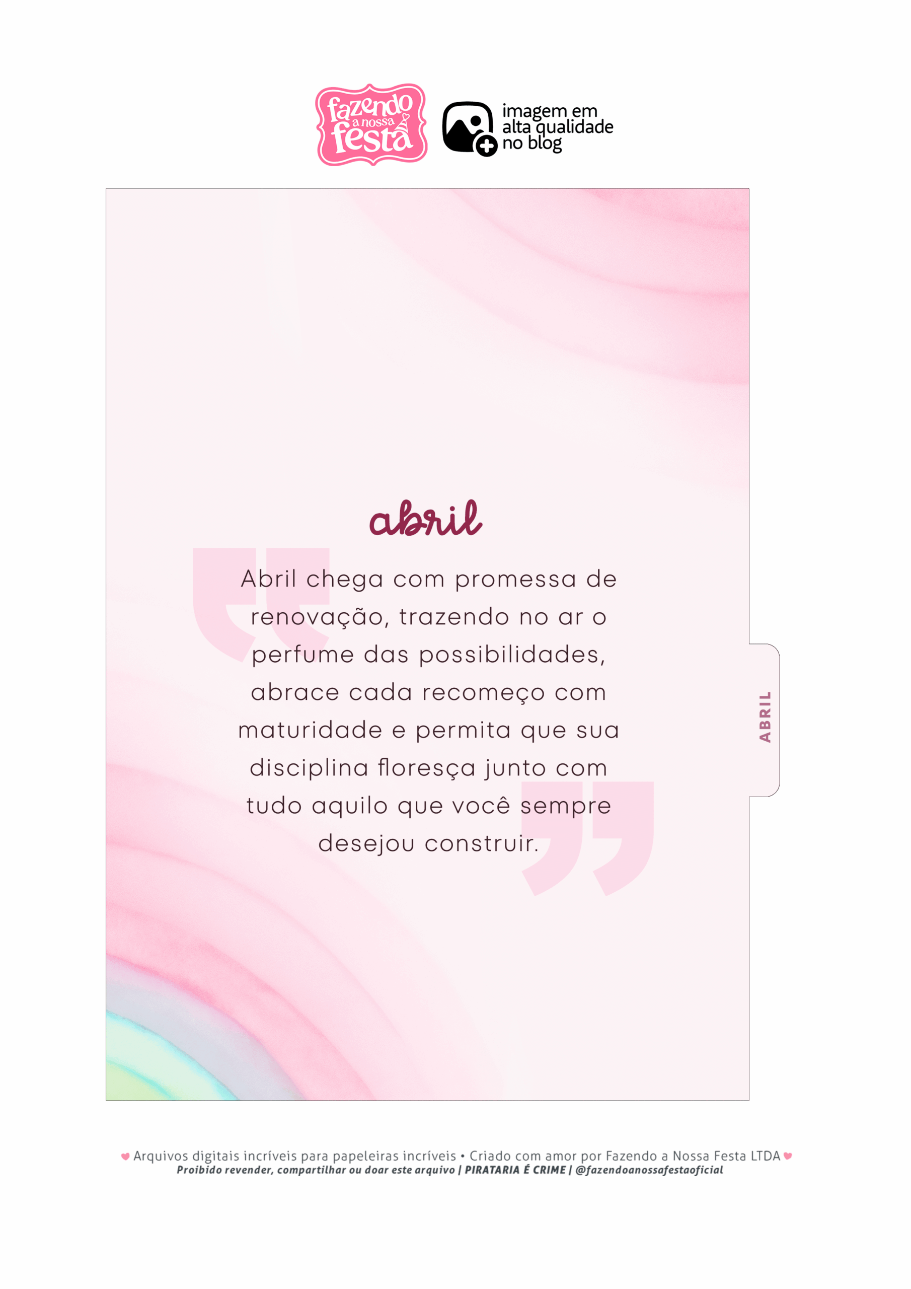 Capa de ABRIL Planner Colorido 2026 Por Aline Gasda - jan 2, 2026 - 0 Comentários - 1 min. leitura Baixar imagemCapa de ABRIL Planner Colorido 2026Você também pode gostar de... Planner Tons Pastéis 2026 – Grátis para Imprimir Planner 2026 para Imprimir Grátis Planner Hello Kitty 2026 – Grátis para Imprimir Planner Professor 2025 – Arquivo Digital – Download Grátis Planner 2025 Xadrez Minimalista para Imprimir – Download Grátis Planner Autismo 2025 – Modelo Grátis + 100 páginas! Aline Gasda Sócia fundadora, professora, apaixonada pela alegria mágica e contagiante do sorriso de uma criança. COMPARTILHE: Facebook WhatsApp WhatsApp Assinar blog por e-mailDigite seu endereço de e-mail para assinar este blog e receber notificações de novas publicações por e-mail. Endereço de e-mail Assinar Pesquisar por: Publicidade
