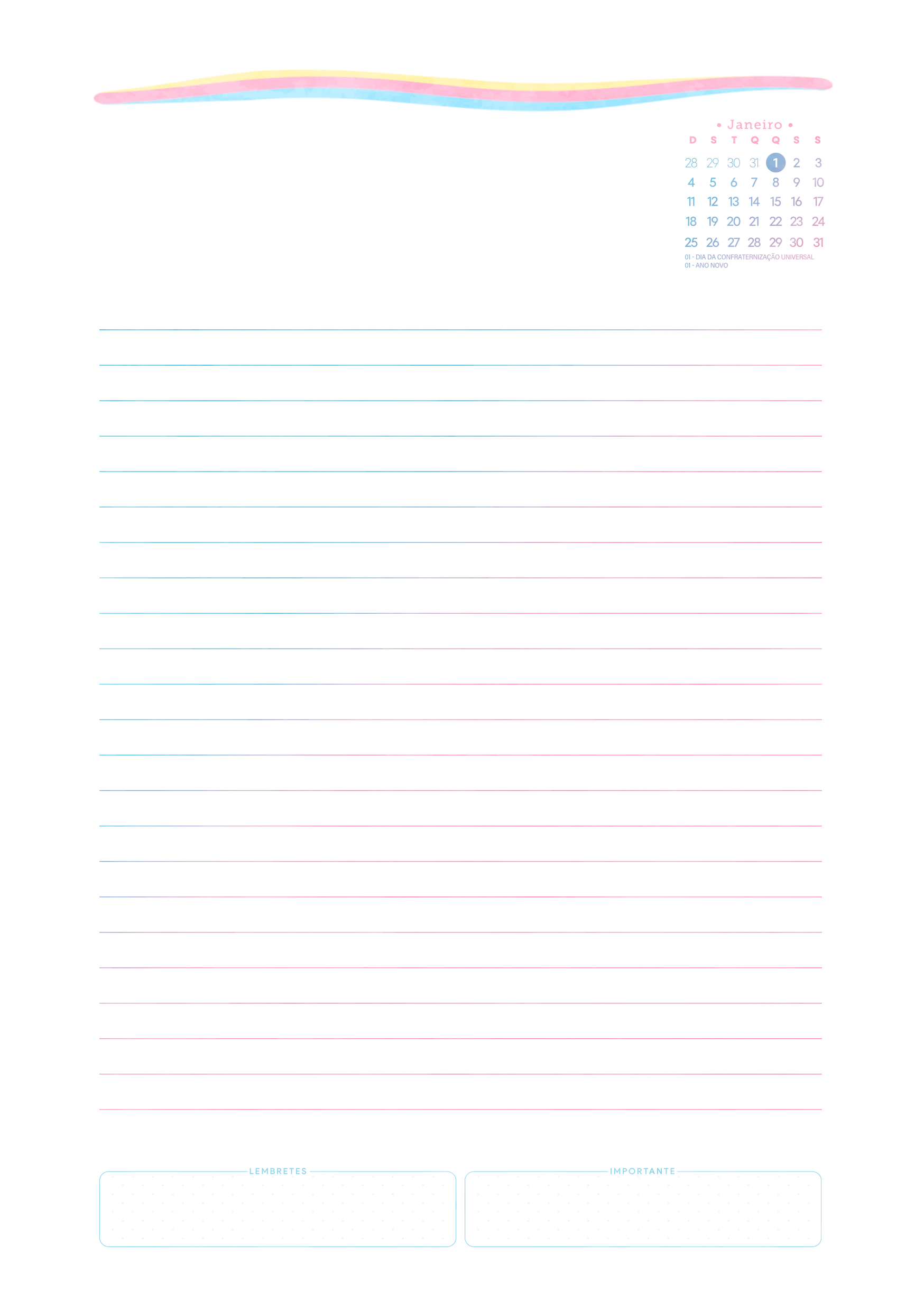 Janeiro Permanente Miolo Agenda sem Hora Planner Colorido 2026 Por Aline Gasda - jan 2, 2026 - 0 Comentários - 1 min. leitura Baixar imagemJaneiro Permanente Miolo Agenda sem Hora Planner Colorido 2026Você também pode gostar de... Planner Tons Pastéis 2026 – Grátis para Imprimir Planner 2026 para Imprimir Grátis Planner Hello Kitty 2026 – Grátis para Imprimir Planner Professor 2025 – Arquivo Digital – Download Grátis Planner 2025 Xadrez Minimalista para Imprimir – Download Grátis Planner Autismo 2025 – Modelo Grátis + 100 páginas! Aline Gasda Sócia fundadora, professora, apaixonada pela alegria mágica e contagiante do sorriso de uma criança. COMPARTILHE: Facebook WhatsApp WhatsApp Assinar blog por e-mailDigite seu endereço de e-mail para assinar este blog e receber notificações de novas publicações por e-mail. Endereço de e-mail Assinar Pesquisar por: Publicidade